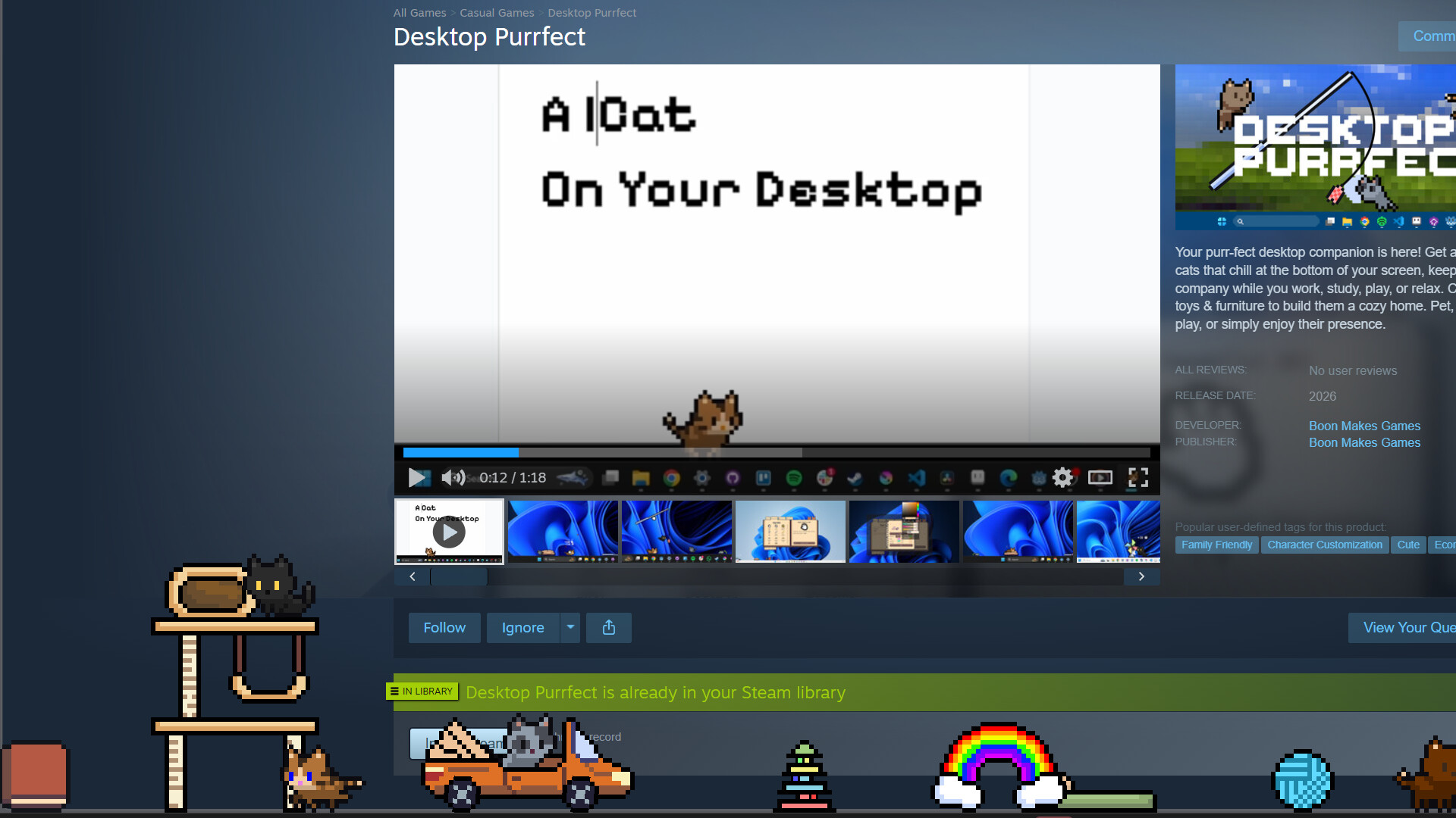 Your purr-fect desktop companion is here! Get adorable cats that chill at the bottom of your screen, keeping you company while you work, study, play, or relax. Collect toys & furniture to build them a cozy home. Pet, feed, play, or simply enjoy their presence.